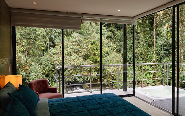 Los alojamientos en el lodge están diseñados para armonizar con el entorno natural, contando con cabañas de madera rústicas pero elegantes situadas a orillas del río Mindo. Los huéspedes pueden dormirse con el relajante sonido del agua fluyendo y despertar con el coro matutino de aves tropicales. Cada suite y cabaña está bien equipada con comodidades modernas, incluyendo baños privados, agua caliente y balcones que ofrecen vistas impresionantes de la exuberante vegetación y el paisaje fluvial.
