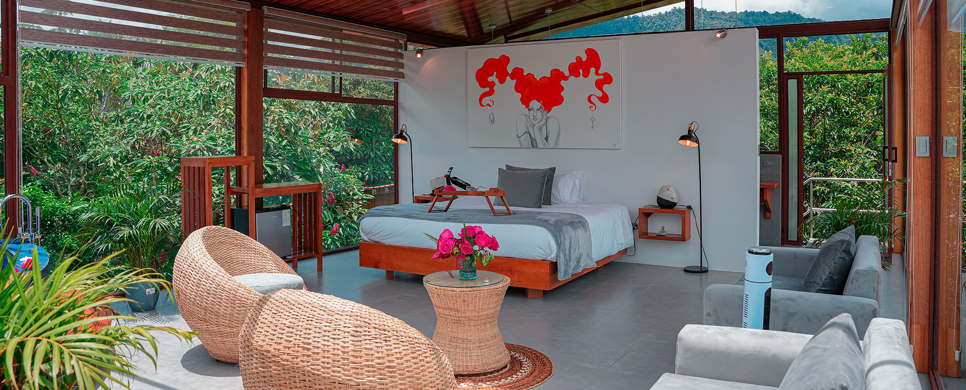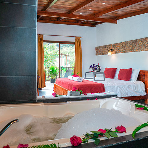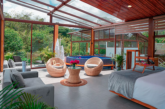 Las opciones de alojamiento incluyen bungalows privados y las innovadoras unidades de 'Cristal Glamping', que permiten una inmersión total en el paisaje con vistas de 360 grados. Muchas de las suites cuentan con jacuzzis interiores privados y balcones diseñados para el descanso profundo. La propiedad está rodeada de jardines vibrantes donde es común observar una gran variedad de colibríes y aves exóticas desde la comodidad de su habitación.
